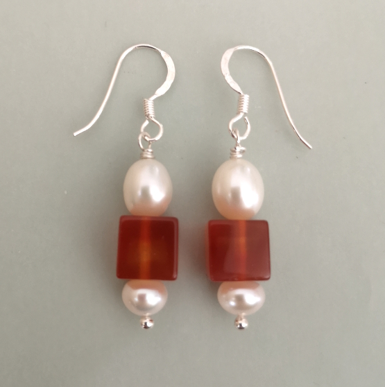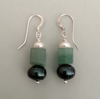 Zwischen den beiden Elementen befindet sich ein kleiner Würfel aus Hämatit. Länge ohne Ohrhaken ca. 24 mm. Ein einzelner Ohrring wiegt ca. 3,6 Gramm.