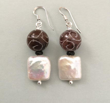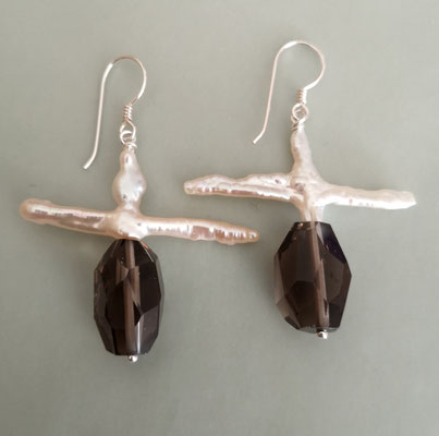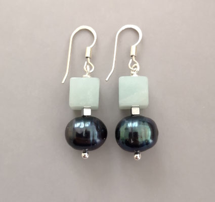 Zwischen den beiden Elementen befindet sich ein Würfel aus Hämatit. Länge ohne Ohrhaken ca. 29 mm. Ein einzelner Ohrring wiegt ca. 4,2 Gramm.