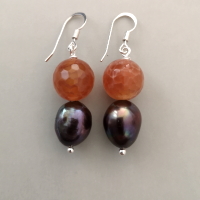 Zwischen den beiden Elementen befindet sich eine Scheibe aus facettiertem Hämatit. Länge ohne Ohrhaken ca. 30 mm. Ein einzelner Ohrring wiegt ca. 6 Gramm.
