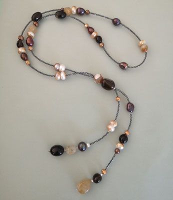 MELANGE - eine lange Y-Kette im Stil der zwanziger Jahre. Ein echter Hingucker - schön zu kombinieren zu allen Naturtönen, Schwarz und Weiß. MELANGE ist eine Komposition aus Süßwasserpeerlen in Braun- und Goldtönen in diversen Größen und Formen mit Rauchquarz- und Citrinnuggets sowie facettiertem, athrazitfarbenem Hämatit und wird einfach über den Kopf angelegt. Die Kette liegt sicher zwischen den Brüsten und ist deswegen auch für eine größere Oberweite geeignet.