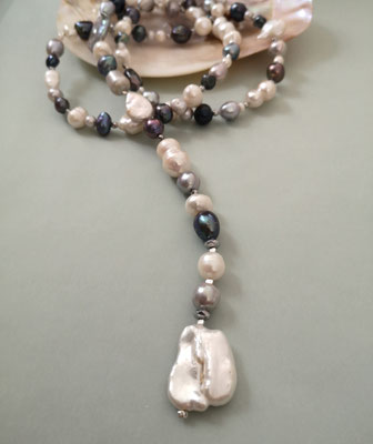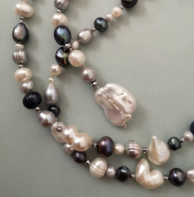 Barocke Süßwasserzuchtperlen in verschiedenen Farben, Größen und Formen machen dieses Unikat zu einem Hingucker und einem modernen Klassiker. den Sie sowohl farblich als auch vom Stil vielfältig kombinieren können. Auf einem Kleid, einem langen Top oder einem durchgehend einfarbigem Outfit kommt diese Kette besonders gut zur Geltung.