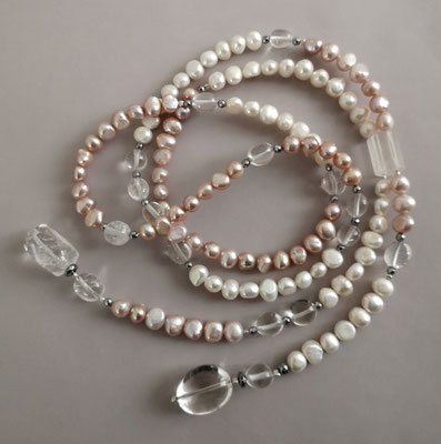 Lange Kette im Stil der zwanziger Jahre. Y-kette aus barocken weißen und rosafarbenen Süßwasserzuchtperlen kombiniert mit Bergkristall in verschiedenen Formen.