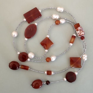SUNSHINE - eine lange Y-Kette im Stil der zwanziger Jahre. Die Kette ist vielseitig zu kombinieren - von eleganten Statement zum "kleinen Schwarzen" bis zum Sommerkleid im Boho-Style. Sie ist aus Carneol und Achat in diversen Formen und Größen mit barocken, weißen Süßwasserperlen und silbernem, facettiertem Hämatit gearbeitet und wird einfach über den Kopf angelegt. Die Kette liegt sicher zwischen den Brüsten und ist deswegen auch für eine größere Oberweite geeignet.